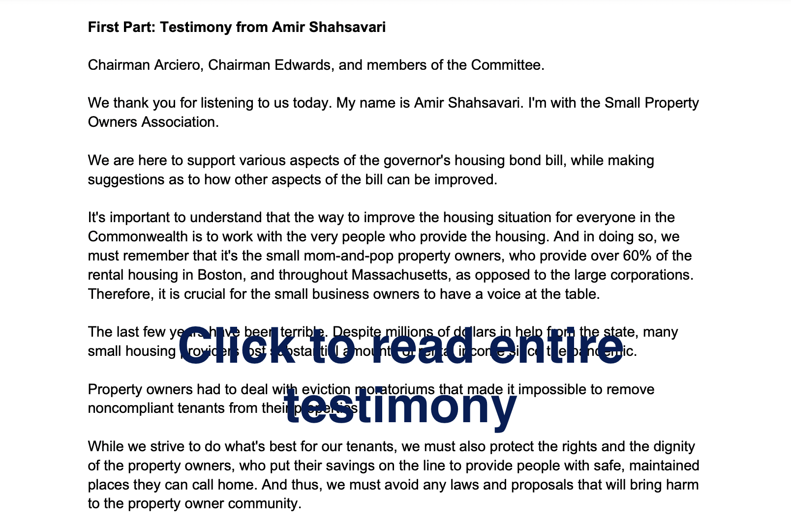 The panel advocated for the interests of property owners and their tenants, while emphasizing the importance of including property owners at the table in creating solutions to the housing dilemma in Massachusetts. The panel also discussed aspects of the bill that it supported, along with aspects that could be improved. You can read the entire testimony below, along with an article that covered SPOA's participation in the hearing.